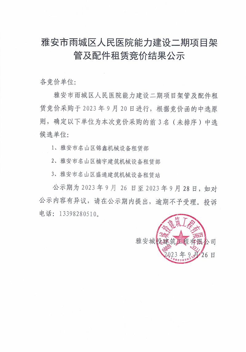 雅安市雨城區人民醫院能力建設二期項目架管及配件租賃競價結果公示