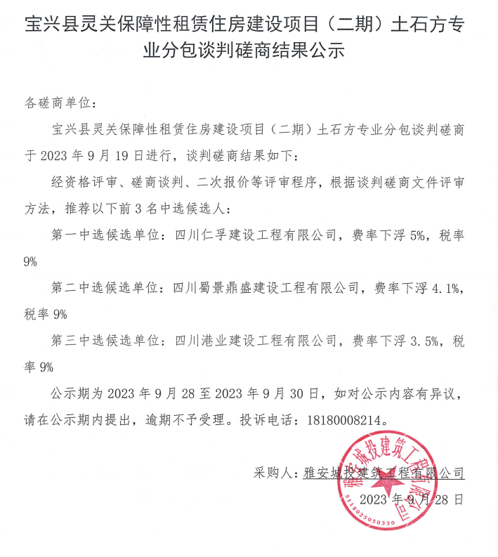 寶興縣靈關保障性租賃住房建設項目(二期)土石方專業分包談判磋商結果公示