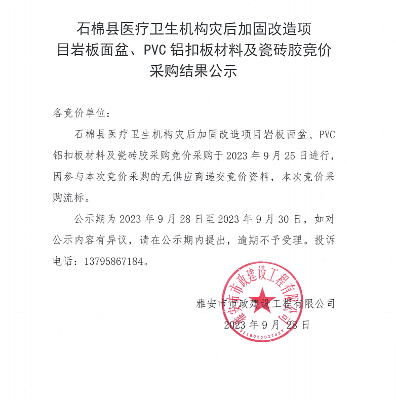 石棉縣醫療衛生機構災后加固改造項目巖板面盆、PVC鋁扣板材料及瓷磚膠競價采購結果公示