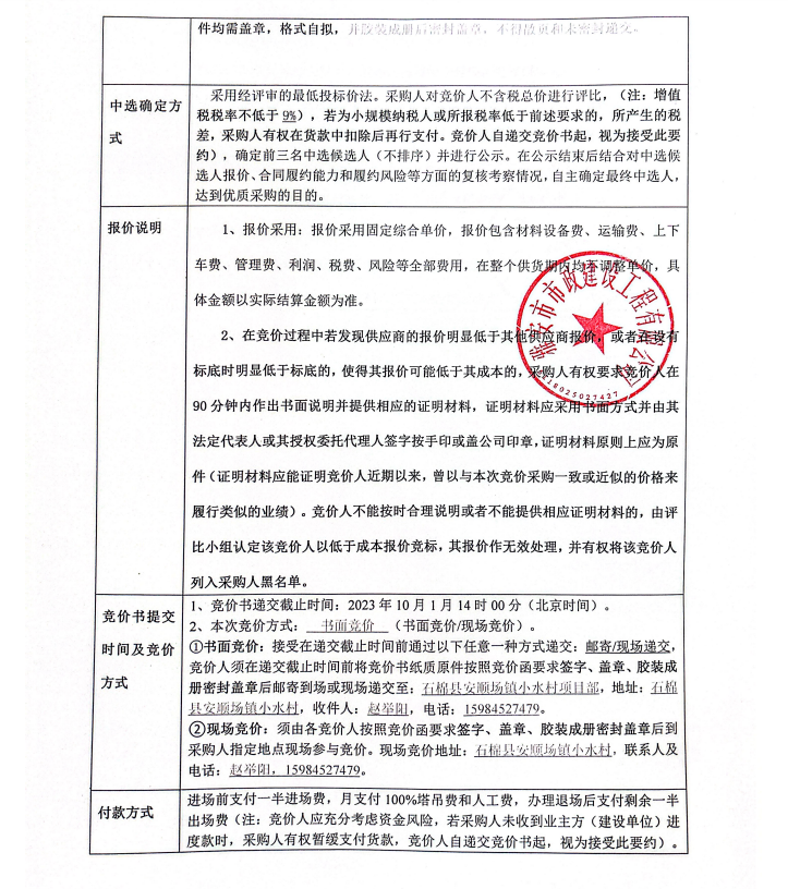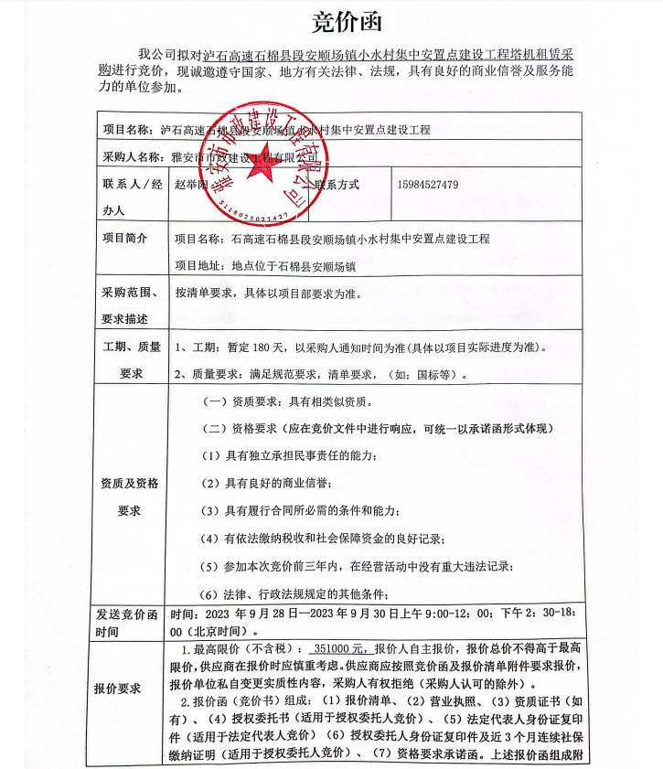 瀘石高速石棉縣段安順場鎮小水村集中安置點建設工程塔機租賃采購競價公告