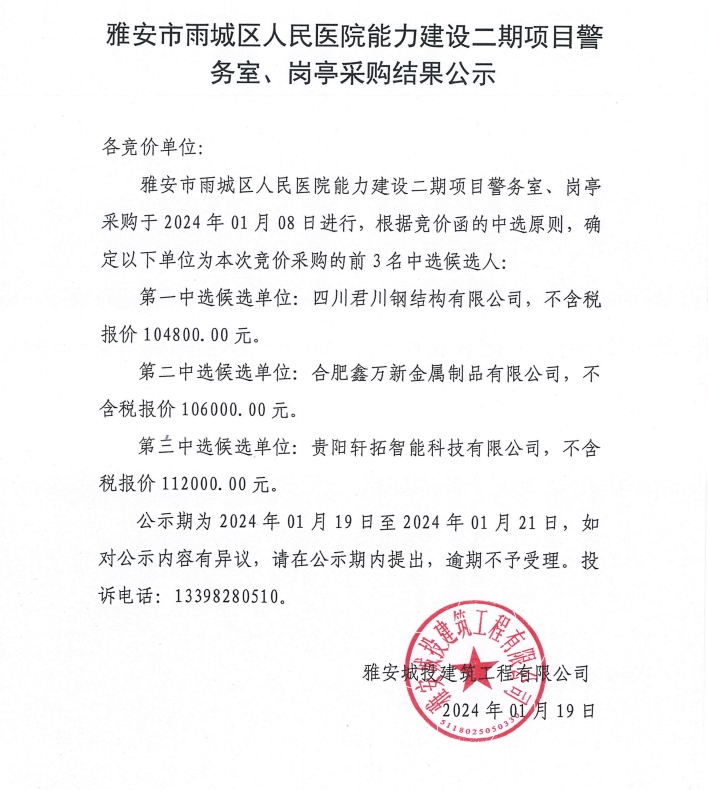 雅安市雨城區(qū)人民醫(yī)院能力建設(shè)二期項(xiàng)目警務(wù)室、崗?fù)げ少徑Y(jié)果公示