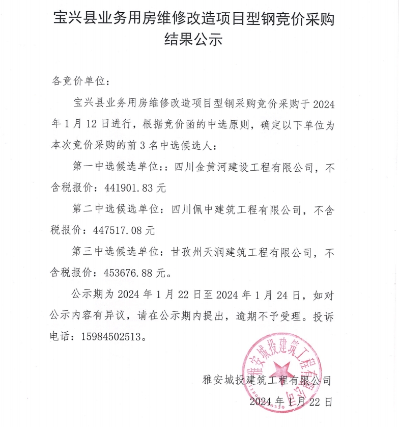 寶興縣業務用房維修改造項目型鋼競價采購結果公示