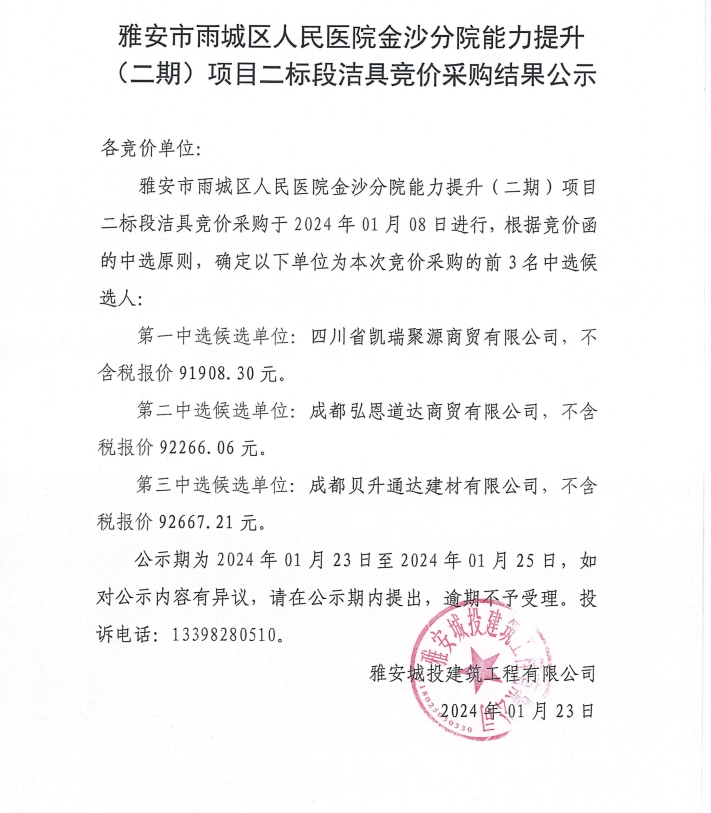 雅安市雨城區人民醫院金沙分院能力提升(二期)項目二標段潔具競價采購結果公示