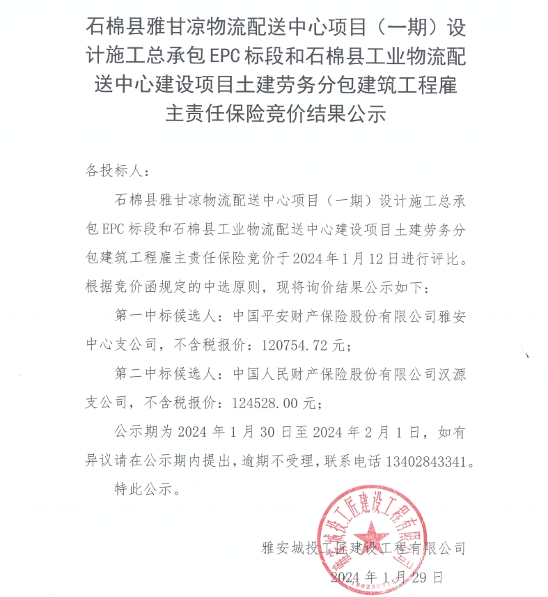 石棉縣雅甘涼物流配送中心項目(一期)設計施工總承包EPC標段和石棉縣工業物流配送中心建設項目土建勞務分包建筑工程雇主責任保險競價結果公示