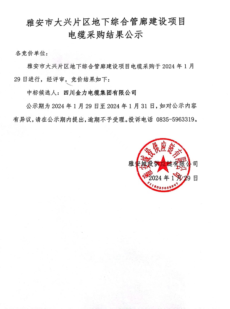 雅安市大興片區地下綜合管廊建設項目電纜采購結果公示