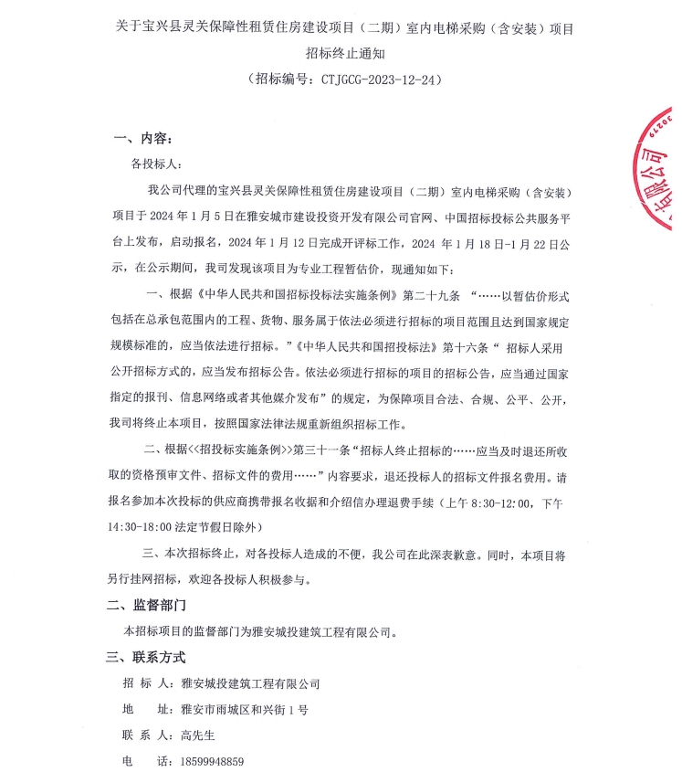 關于寶興縣靈關保障性租賃住房建設項目(二期)室內電梯采購(含安裝)項目招標終止通知