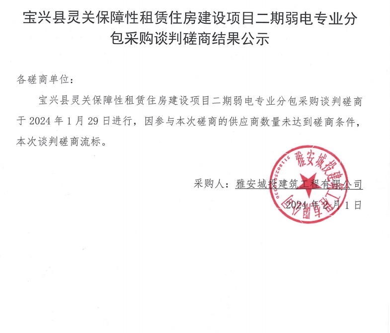 寶興縣靈關保障性租賃住房建設項目二期弱電專業分包采購談判磋商結果公示