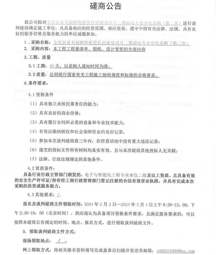 寶興縣靈關保障性租賃住房建設項目二期弱電專業分包采購(第二次)談判磋商公告