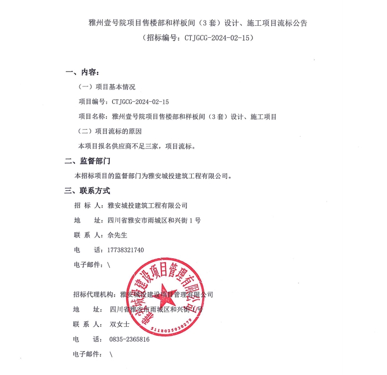 雅州壹號院項目售樓部和樣板間(3套)設計、施工項目流標公告