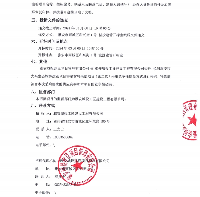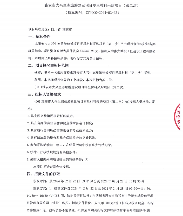 雅安市大興生態旅游建設項目零星材料采購項目(第二次)公告