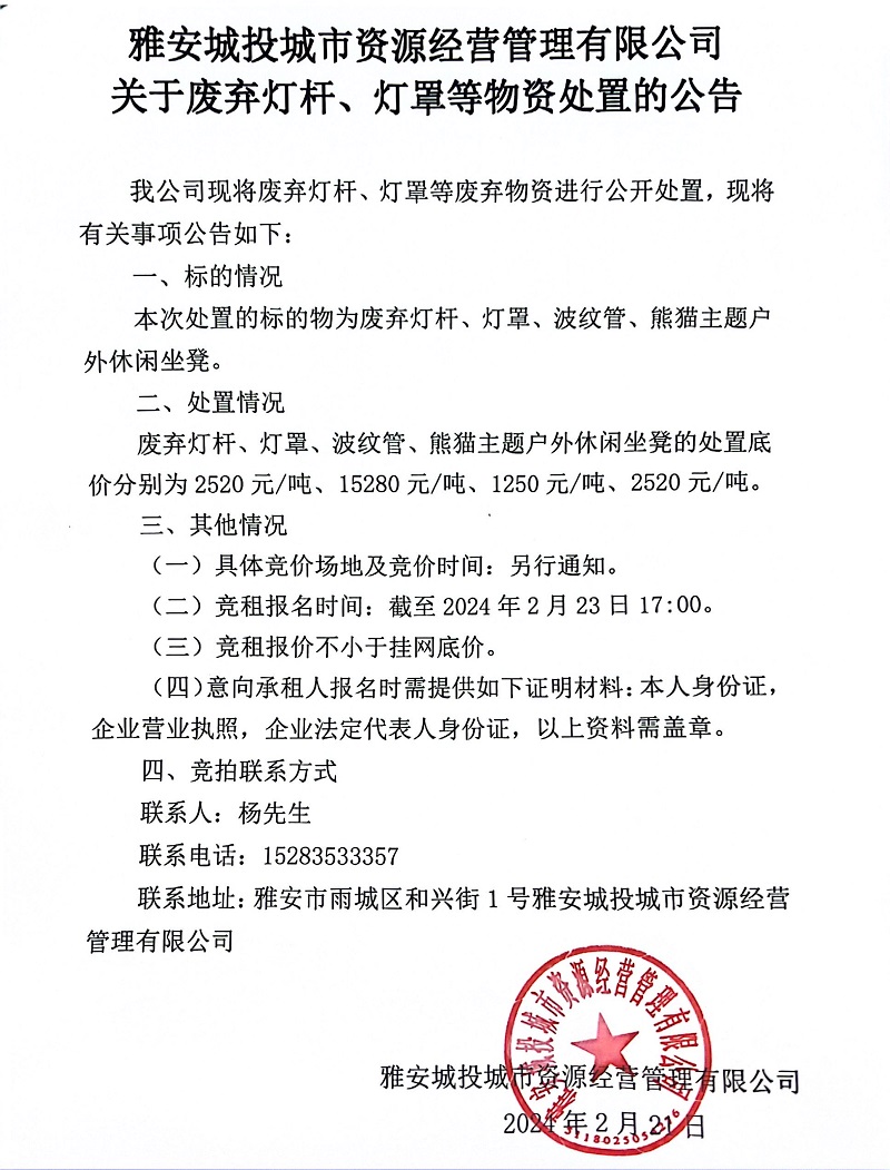 雅安城投城市資源經營管理有限公司關于廢棄燈桿、燈罩等物資處置的公告