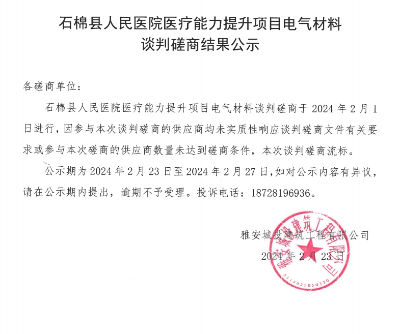 石棉縣人民醫院醫療能力提升項目電氣材料談判磋商結果公示