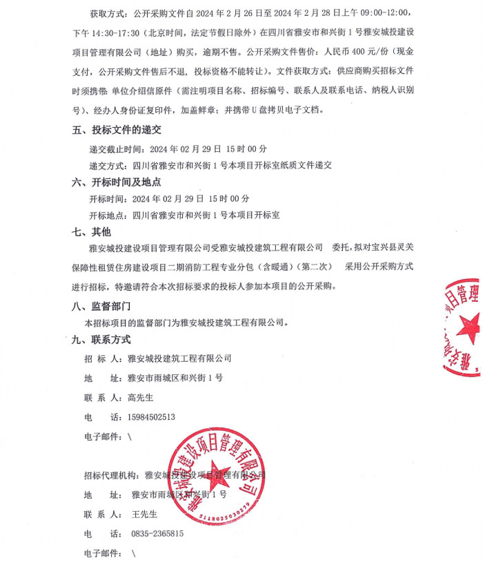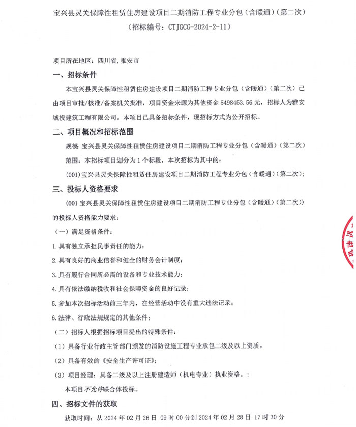 寶興縣靈關保障性租賃住房建設項目二期消防工程專業分包(含暖通)(第二次)公告