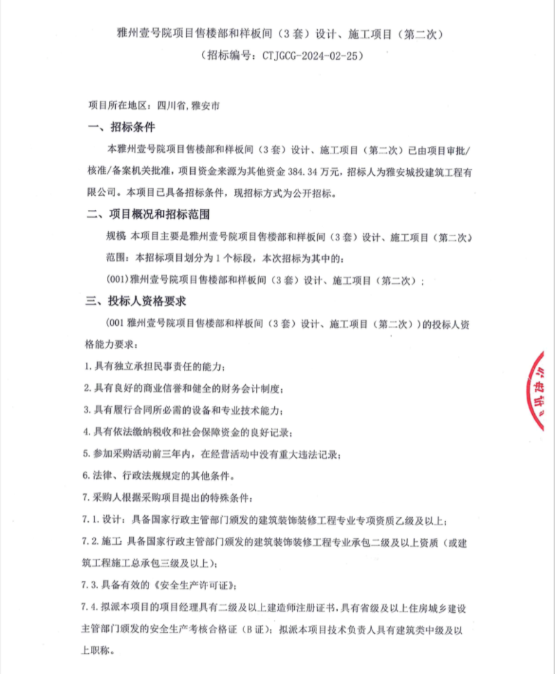 雅州壹號院項目售樓部和樣板間(3套)設計、施工項目(第二次)公告