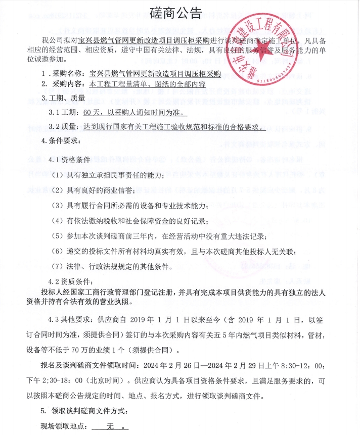 寶興縣燃氣管網更新改造項目調壓柜采購談判磋商公告