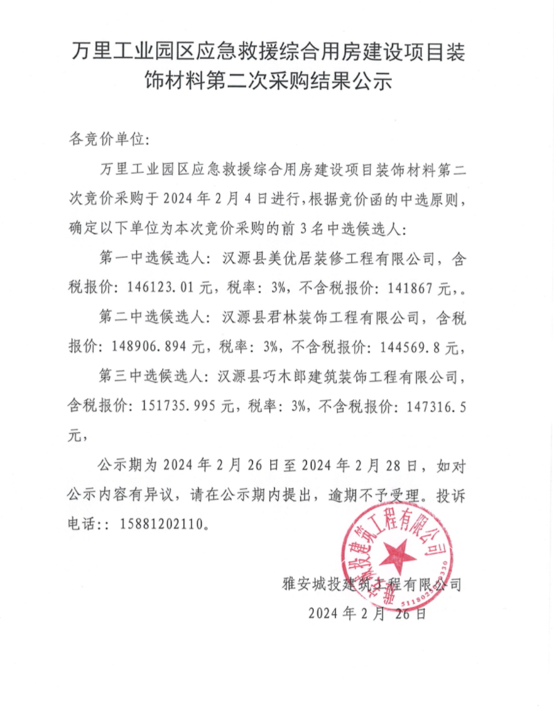 萬里工業園區應急救援綜合用房建設項目裝飾材料第二次采購結果公示