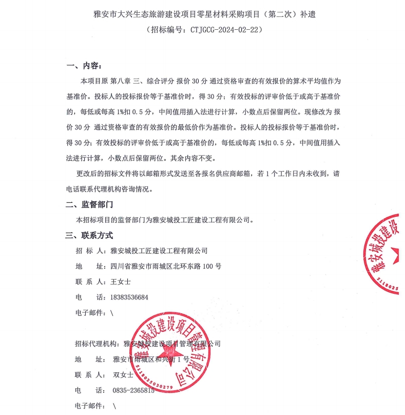 雅安市大興生態旅游建設項目零星材料采購項目(第二次)補遺公告