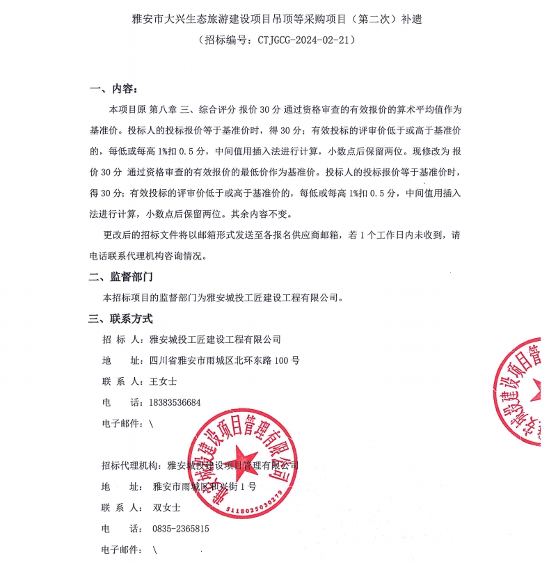 雅安市大興生態旅游建設項目吊頂等采購項目(第二次)補遺公告