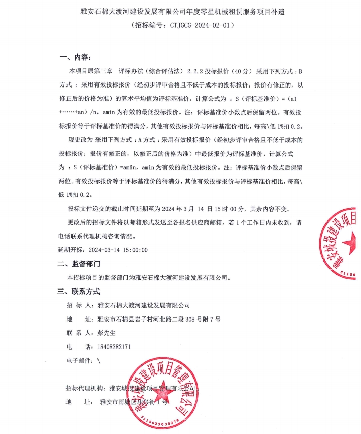 雅安石棉大渡河建設發展有限公司年度零星機械租賃服務項目補遺公告