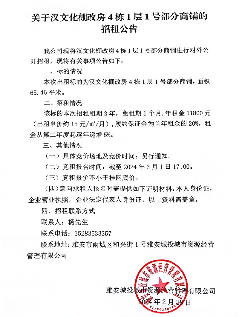 關于漢文化棚改房4棟1層1號部分商鋪的招租公告