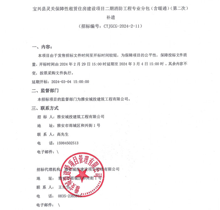 寶興縣靈關保障性租賃住房建設項目二期消防工程專業分包(含暖通)(第二次)補遺公告