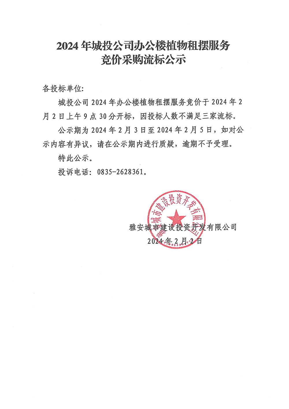 2024年城投公司辦公樓植物租擺服務競價采購流標公示
