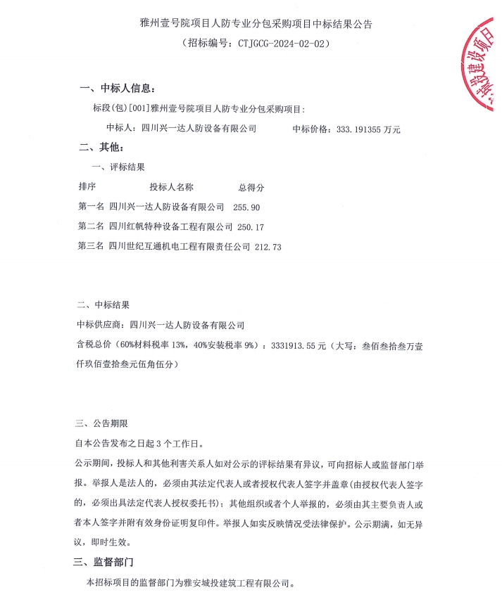 雅州壹號院項目人防專業分包采購項目中標結果公告