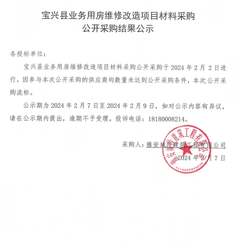 寶興縣業務用房維修改造項目材料采購公開采購結果公示