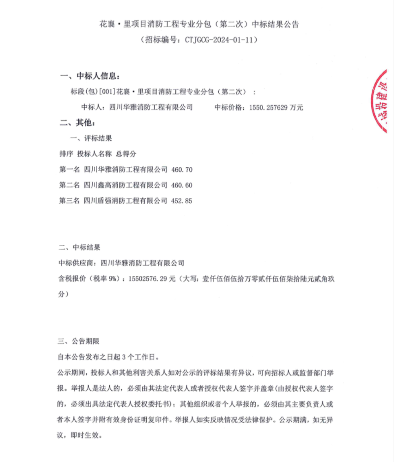 花襄·里項目消防工程專業分包(第二次)中標結果公告