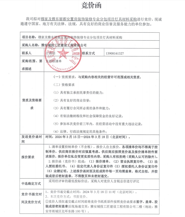 穆家及雅東麗都安置房裝飾裝修專業分包項目燈具材料采購競價公告
