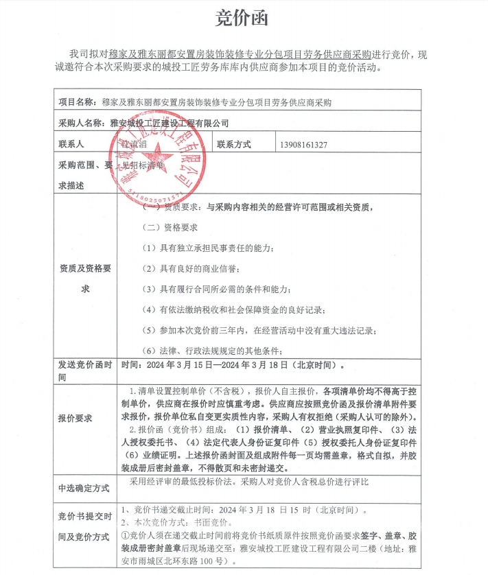 穆家及雅東麗都安置房裝飾裝修專業分包項目勞務供應商采購競價公告