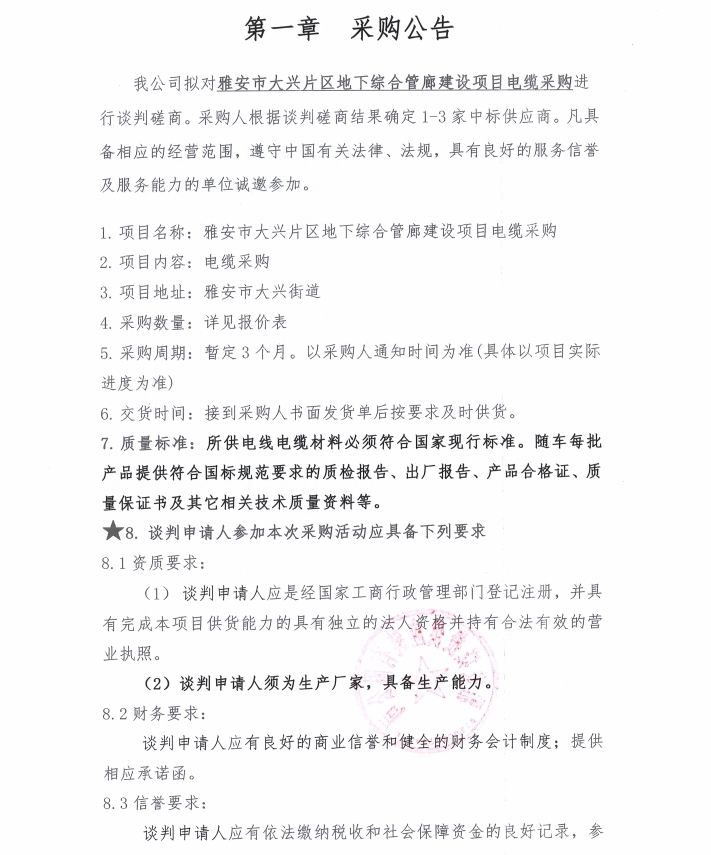 雅安市大興片區地下綜合管廊建設項目電纜采購公告