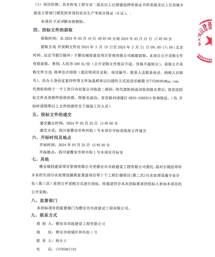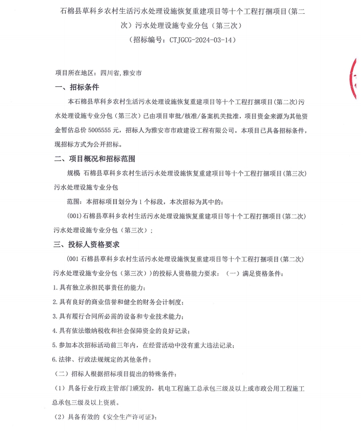 石棉縣草科鄉(xiāng)農(nóng)村生活污水處理設(shè)施恢復(fù)重建項目等十個工程打捆項目(第二次)污水處理設(shè)施專業(yè)分包(第三次)公告