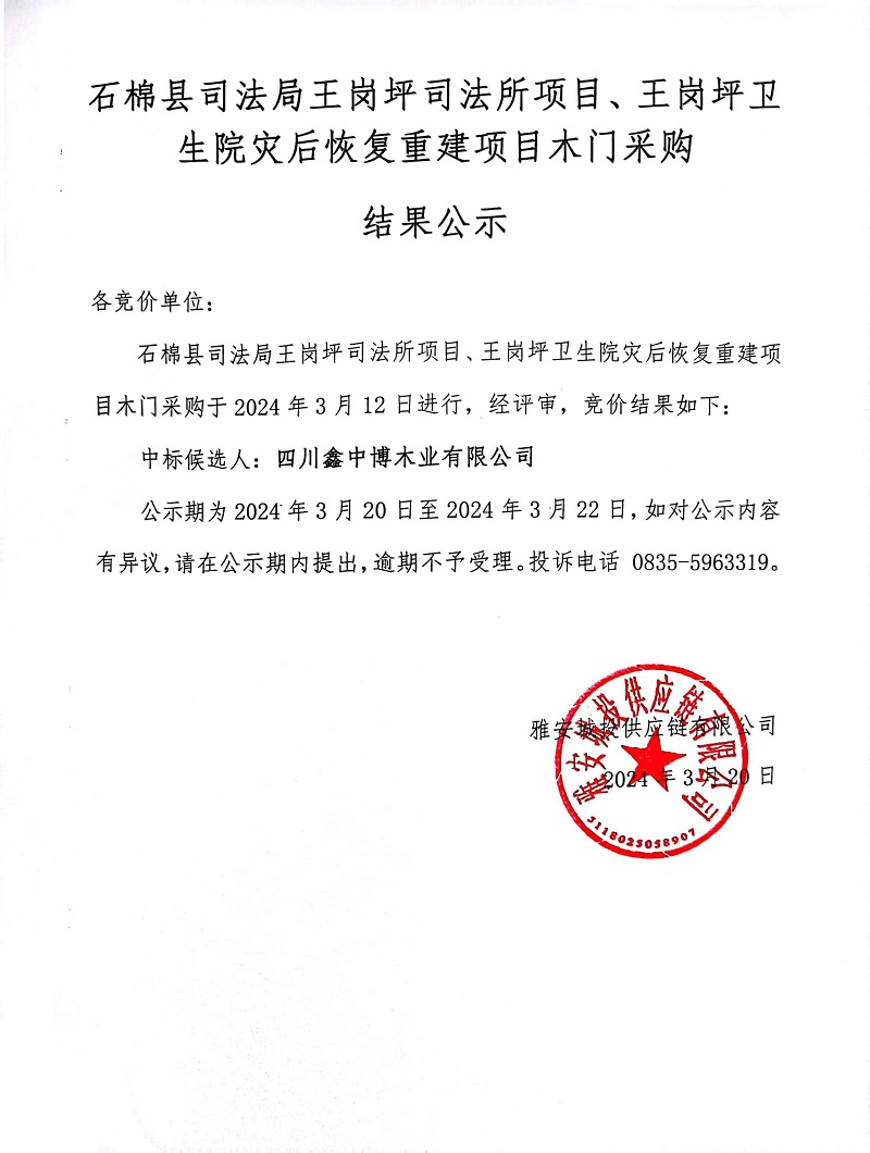 石棉縣司法局王崗坪司法所項目、王崗坪衛生院災后恢復重建項目木門采購結果公示