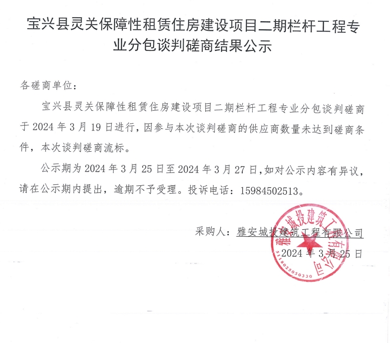 寶興縣靈關保障性租賃住房建設項目二期欄桿工程專業分包談判磋商結果公示