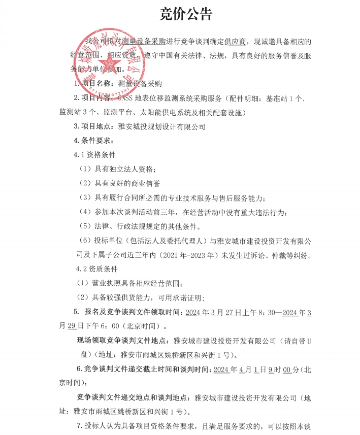 測量設(shè)備GNSS地表位移監(jiān)測系統(tǒng)采購競價(jià)公告