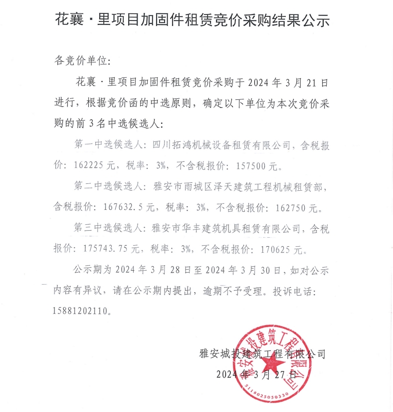 花襄·里項目加固件租賃競價采購結(jié)果公示