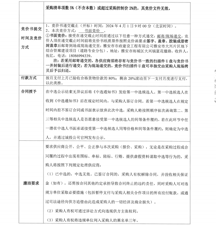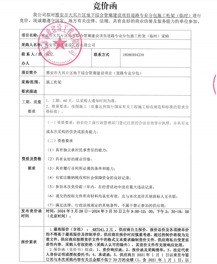 雅安市大興片區(qū)地下綜合管廊建設項目道路專業(yè)分包施工桁架(臨時)采購競價公告