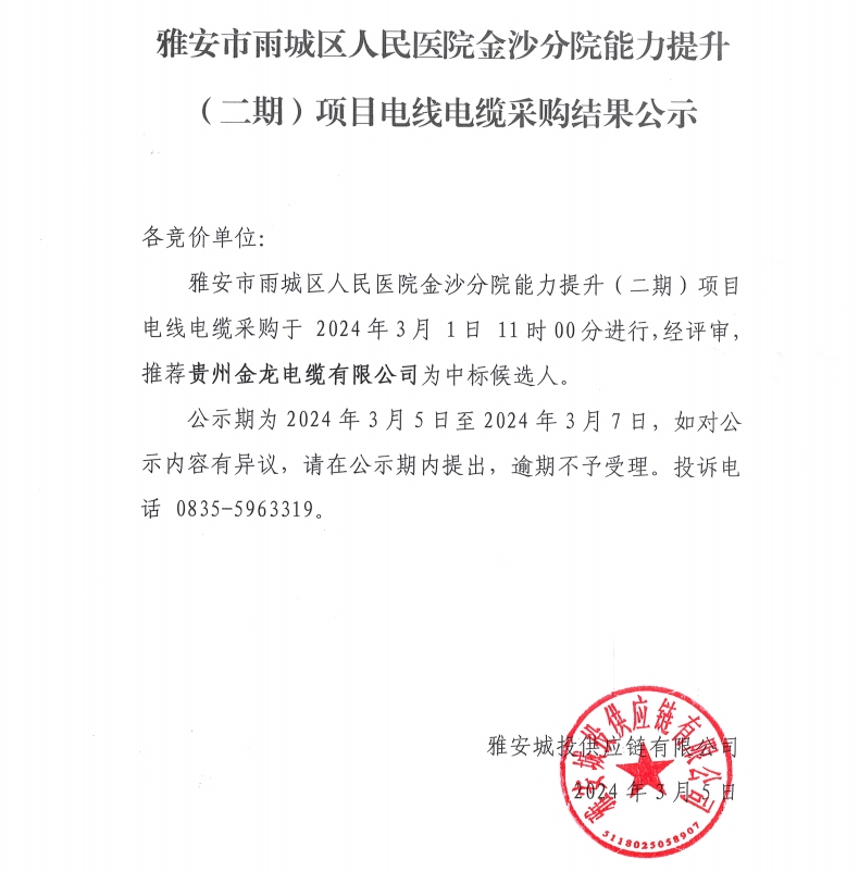 雅安市雨城區(qū)人民醫(yī)院金沙分院能力提升(二期)項(xiàng)目電線電纜采購(gòu)結(jié)果公示