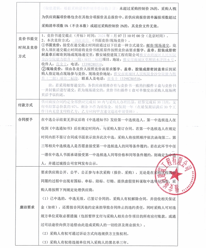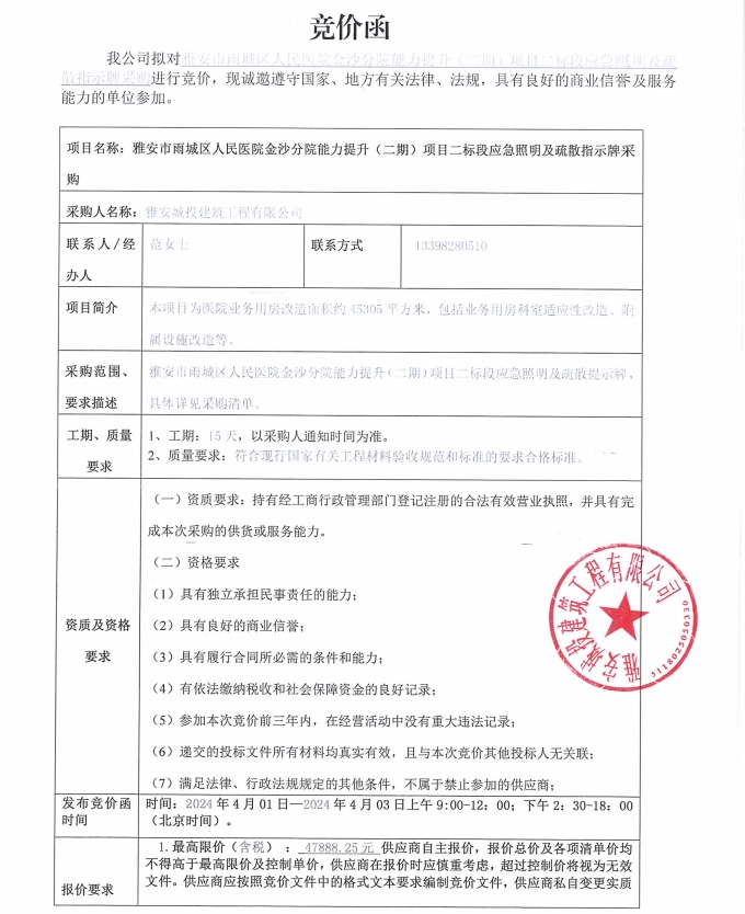 雅安市雨城區人民醫院金沙分院能力提升(二期)項目二標段應急照明及疏散指示牌采購競價公告