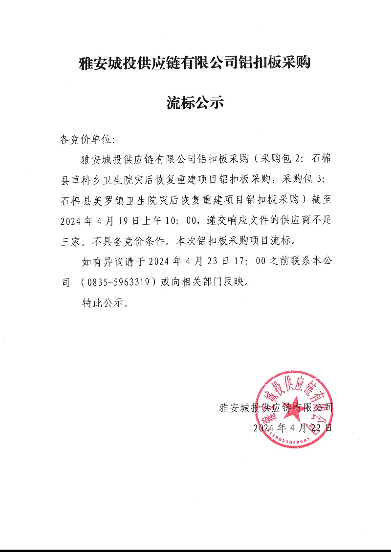 雅安城投供應鏈有限公司鋁扣板采購流標公示