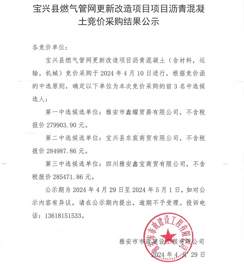 寶興縣燃氣管網更新改造項目瀝青混凝土競價采購結果公示