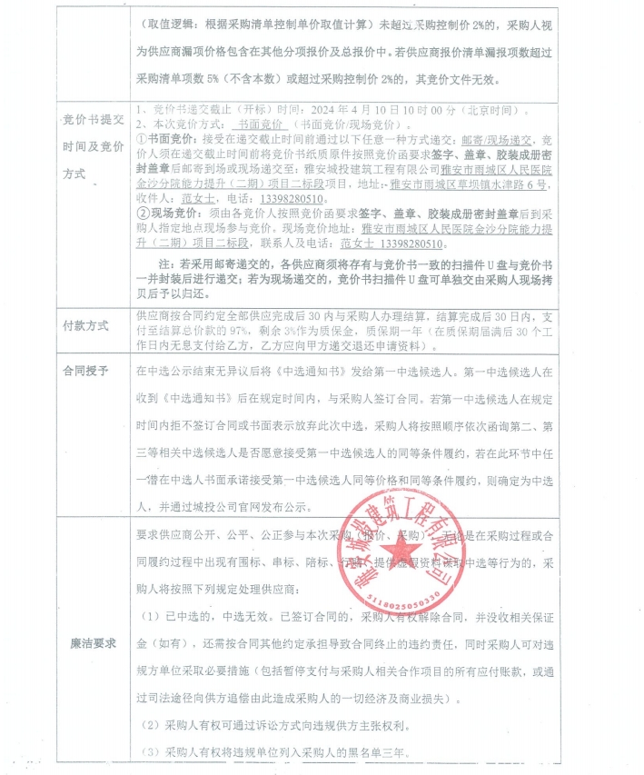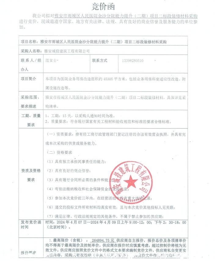 雅安市雨城區人民醫院金沙分院能力提升(二期)項目二標段裝修材料采購競價公告