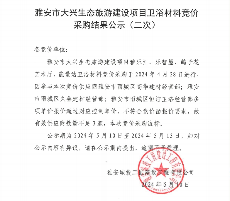 雅安市大興生態旅游建設項目衛浴材料競價采購結果公示(二次)