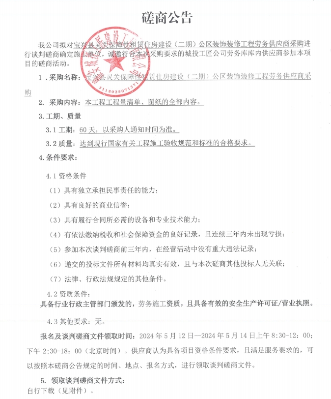 寶興縣靈關保障性租賃住房建設(二期)公區裝飾裝修工程勞務供應商采購談判磋商公告