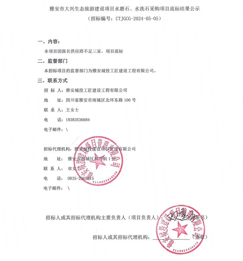 雅安市大興生態(tài)旅游建設(shè)項(xiàng)目水磨石、水洗石采購(gòu)項(xiàng)目流標(biāo)結(jié)果公示