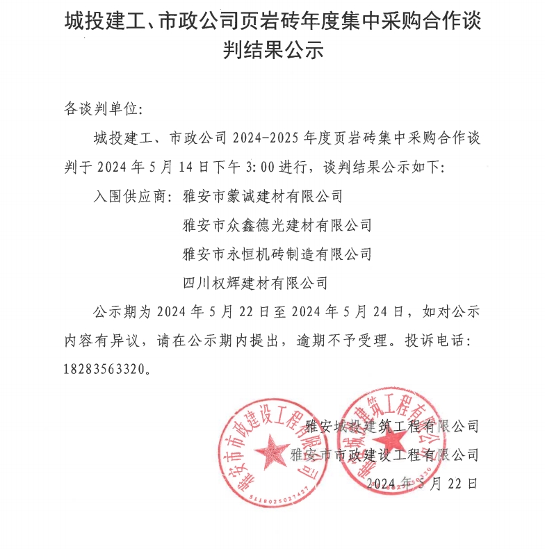 城投建工、市政公司頁巖磚年度集中采購合作談判結果公示