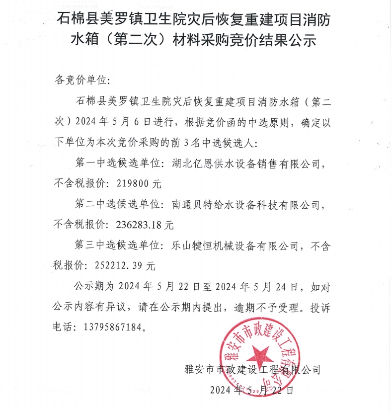 石棉縣美羅鎮衛生院災后恢復重建項目消防水箱(第二次)材料采購競價結果公示