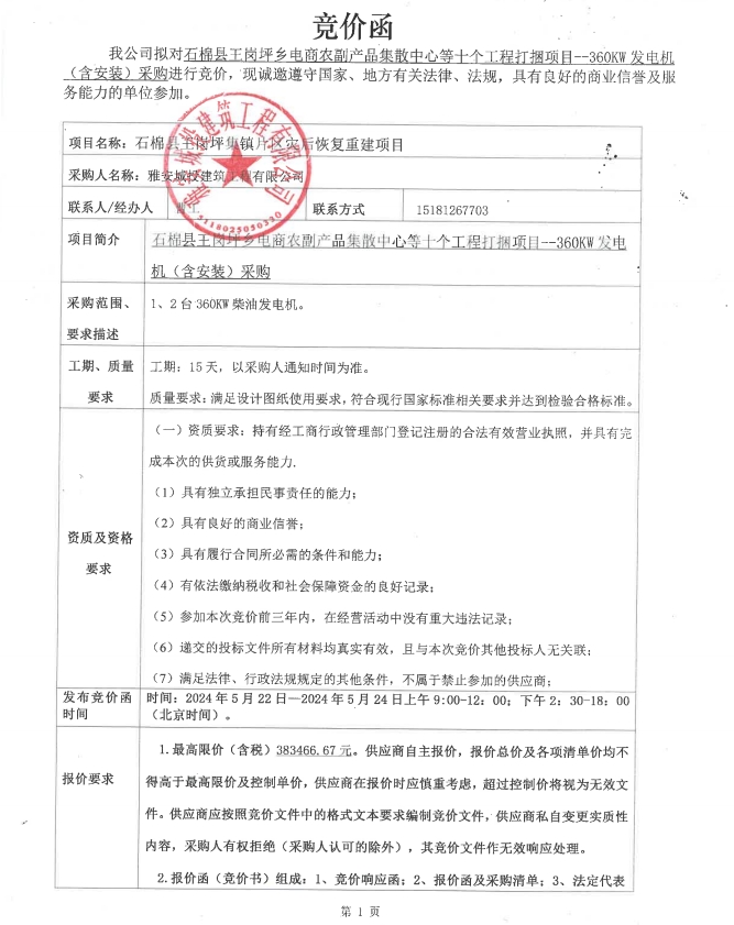 石棉縣王崗坪鄉電商農副產品集散中心等十個工程打捆項目--360KW發電機(含安裝)采購競價公告
