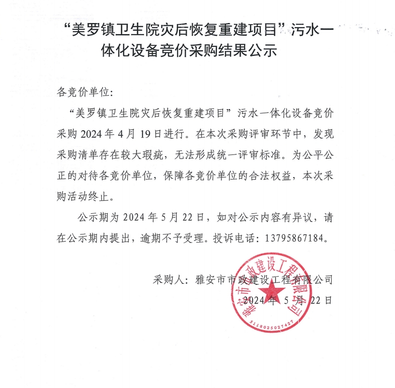 美羅鎮(zhèn)衛(wèi)生院災后恢復重建項目污水一體化設備競價采購結(jié)果公示